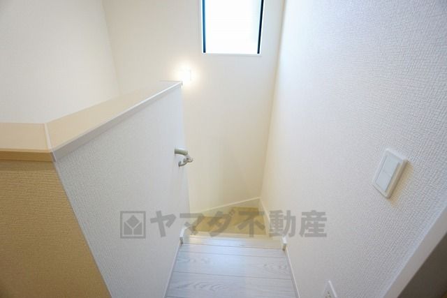 小さなお子様やご高齢の方でも安心できる、手すり付き階段。段差も低めで設定されており、安全性にも優れています。