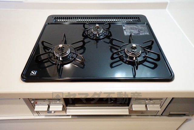同時にたくさんの料理が調理できる3口コンロ。長時間熱を通しておきたい煮込み料理を作りながら、炒め物など同時進行で進められます。