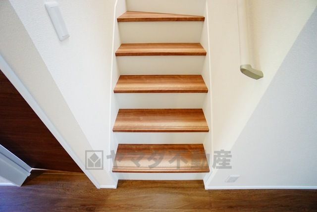 小さなお子様やご高齢の方でも安心できる、手すり付き階段。段差も低めで設定されており、安全性にも優れています。