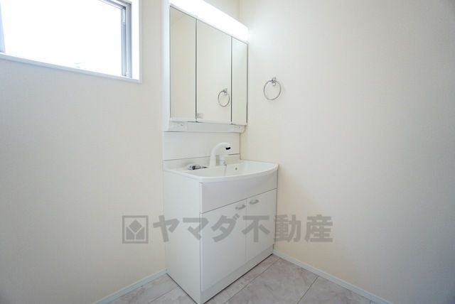 三面鏡つき洗面台。鏡裏にたっぷりとした収納スペースがあります。鏡を閉めてしまえば小物は見えないため、スッキリとした印象の洗面台にできます。