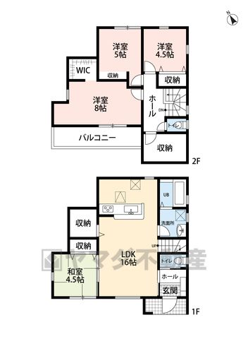 LDK16畳(1F)、和4.5畳(1F)、洋4.5畳(2F)、洋5畳(2F)、洋8畳(2F) |