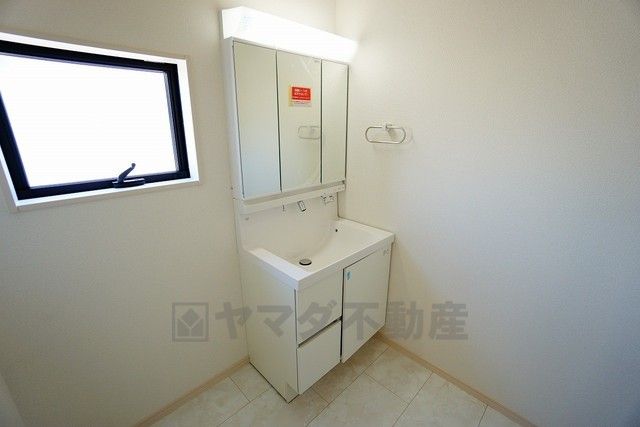 同仕様写真。三面鏡つき洗面台。鏡裏にたっぷりとした収納スペースがあります。鏡を閉めてしまえば小物は見えないため、スッキリとした印象の洗面台にできます。