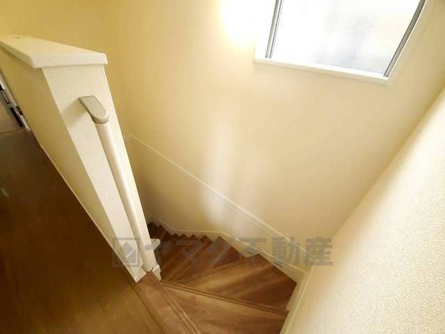 小さなお子様やご高齢の方でも安心できる、手すり付き階段。段差も低めで設定されており、安全性にも優れています。
