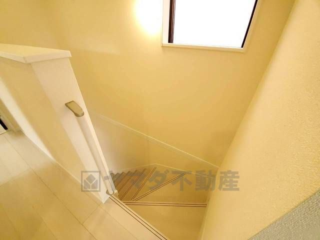 小さなお子様やご高齢の方でも安心できる、手すり付き階段。段差も低めで設定されており、安全性にも優れています。