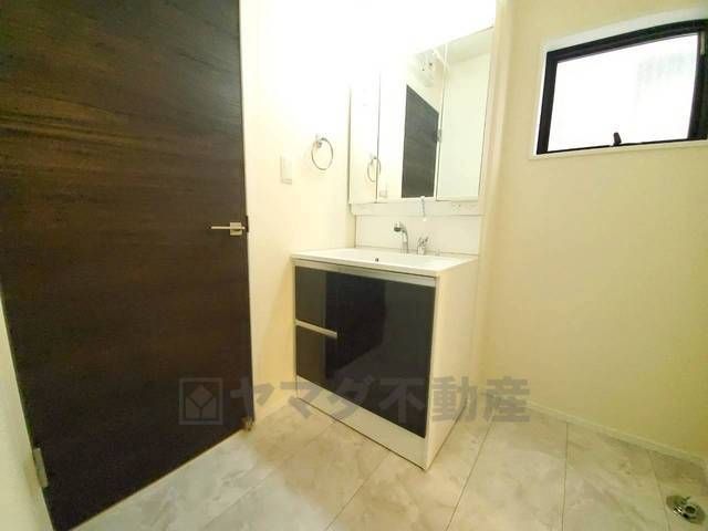 三面鏡つき洗面台。鏡裏にたっぷりとした収納スペースがあります。鏡を閉めてしまえば小物は見えないため、スッキリとした印象の洗面台にできます。