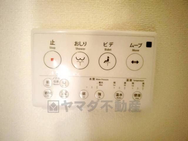 壁リモコンタイプのウォシュレット付き。すっきりした見た目で、トイレ奥の掃除もしやすいです。