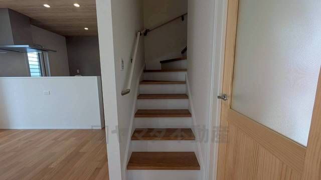 小さなお子様やご高齢の方でも安心できる、手すり付き階段。段差も低めで設定されており、安全性にも優れています。