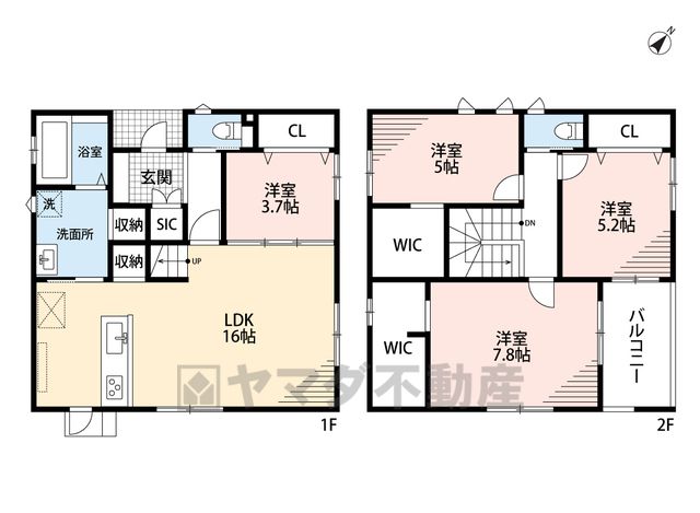 LDK16畳(1F)、洋3.7畳(1F)、洋5畳(2F)、洋5.2畳(2F)、洋7.8畳(2F) |