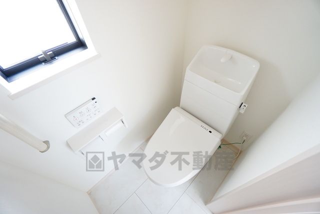 温水洗浄機付トイレです。節水機能もあるので、安心して使えますね。もちろん、1階2階の2ヶ所にトイレがあるので、忙しい朝にもゆとりができますね。