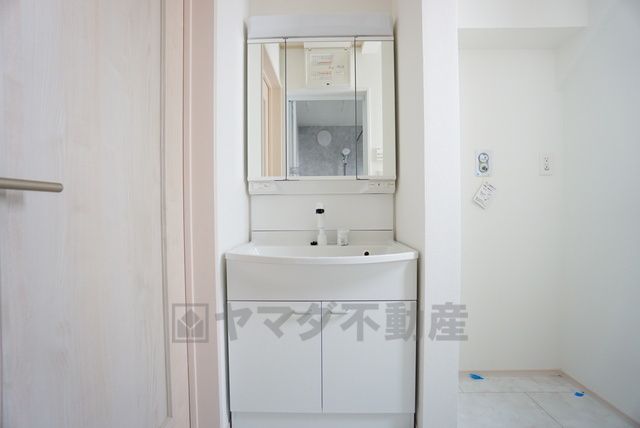 三面鏡つき洗面台。鏡裏にたっぷりとした収納スペースがあります。鏡を閉めてしまえば小物は見えないため、スッキリとした印象の洗面台にできます。