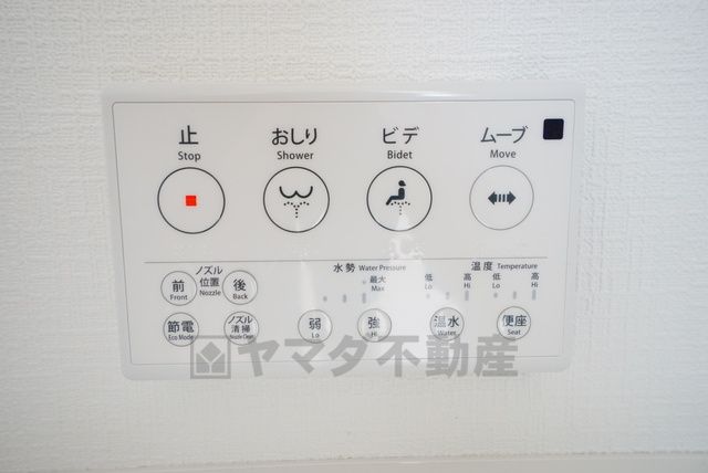 壁リモコンタイプのウォシュレット付き。すっきりした見た目で、トイレ奥の掃除もしやすいです。