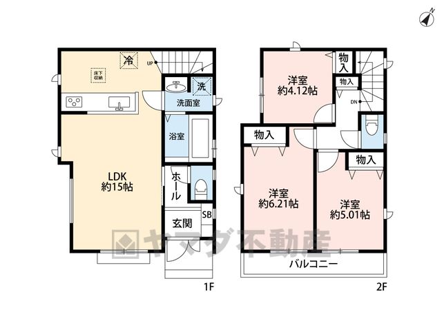 LDK15畳(1F)、洋4.1畳(2F)、洋5畳(2F)、洋6.2畳(2F) |
