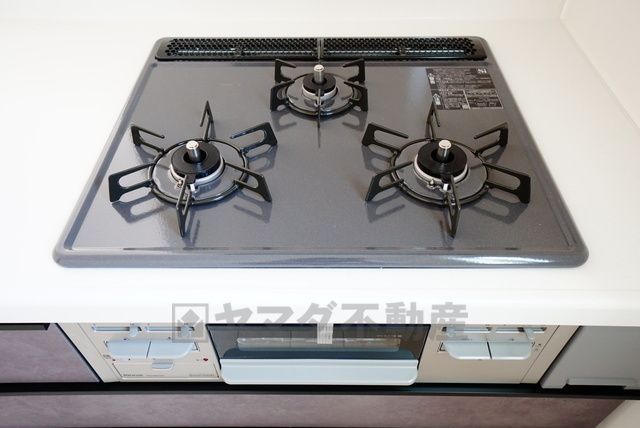 同時にたくさんの料理が調理できる3口コンロ。長時間熱を通しておきたい煮込み料理を作りながら、炒め物など同時進行で進められます。