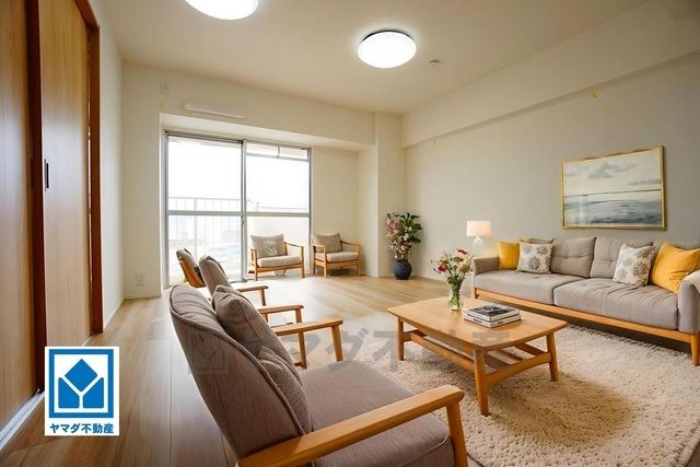 家具はイメージです。大きな窓のあるリビングは、陽光あふれる明るい空間です。居心地良く、ご家族皆がゆったり寛げる憩いの空間となりそうです。