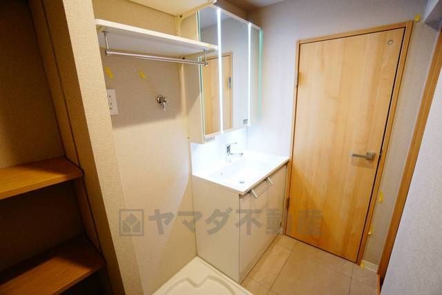三面鏡つき洗面台。鏡裏にたっぷりとした収納スペースがあります。鏡を閉めてしまえば小物は見えないため、スッキリとした印象の洗面台にできます。