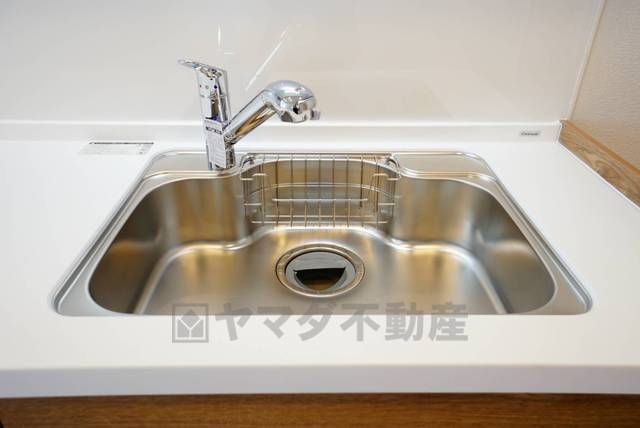 広々としたステンレスシンクには、洗剤やスポンジを収納出来るラック付き。広さも確保しているので、大きなお鍋も洗いやすいです。