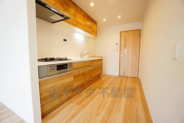 部屋の端に位置する壁付けキッチンは、デッドスペースができにくく、リビング・ダイニングを無駄なく広く活用できます。