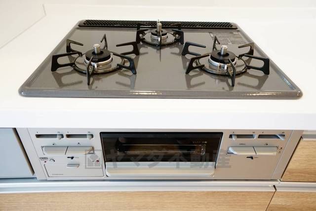 同時にたくさんの料理が調理できる3口コンロ。長時間熱を通しておきたい煮込み料理を作りながら、炒め物など同時進行で進められます。