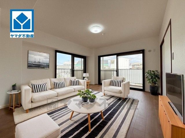 家具はイメージです。大きな窓のあるリビングは、陽光あふれる明るい空間です。居心地良く、ご家族皆がゆったり寛げる憩いの空間となりそうです。