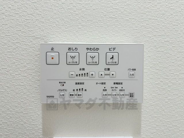 壁リモコンタイプのウォシュレット付き。節水機能もあるので、安心して使えますね。