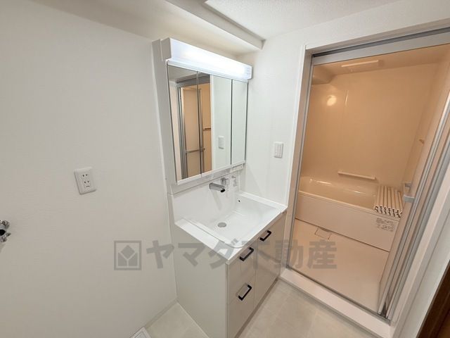 三面鏡つき洗面台。鏡裏にたっぷりとした収納スペースがあります。鏡を閉めてしまえば小物は見えないため、スッキリとした印象の洗面台にできます。