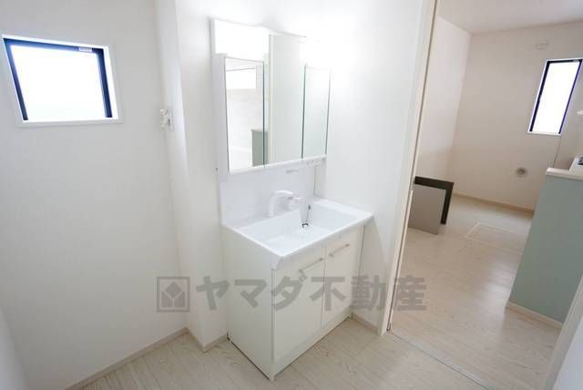 三面鏡つき洗面台。鏡裏にたっぷりとした収納スペースがあります。鏡を閉めてしまえば小物は見えないため、スッキリとした印象の洗面台にできます。
