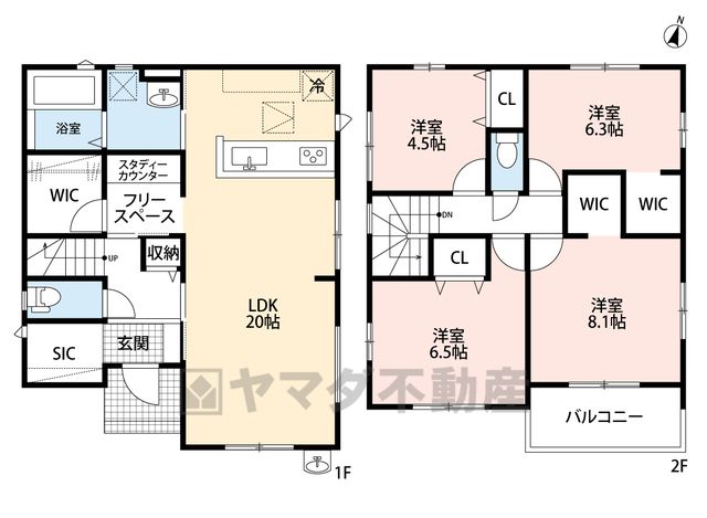 LDK20畳(1F)、洋4.5畳(2F)、洋6.3畳(2F)、洋6.5畳(2F)、洋8.1畳(2F) |