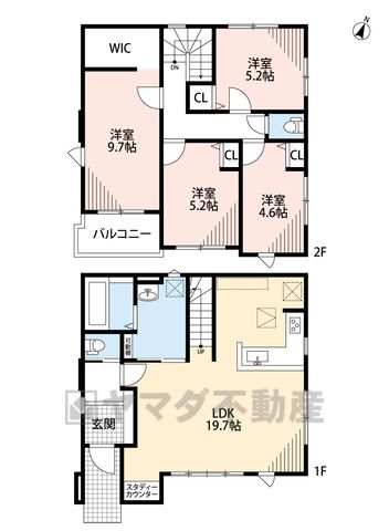 LDK19.7畳(1F)、洋4.6畳(2F)、洋5.2畳(2F)、洋9.7畳(2F) |