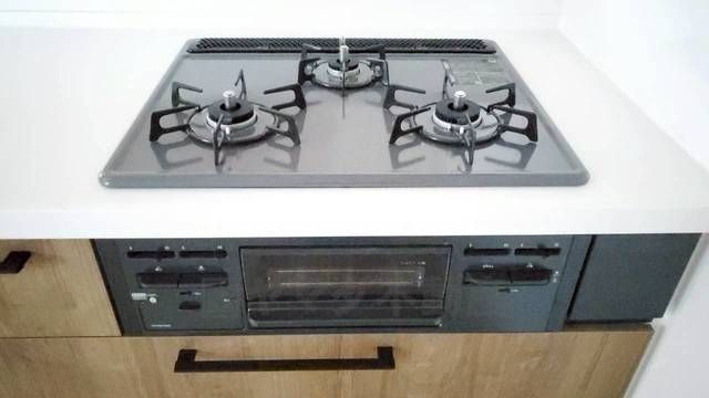 同時にたくさんの料理が調理できる3口コンロ。長時間熱を通しておきたい煮込み料理を作りながら、炒め物など同時進行で進められます。