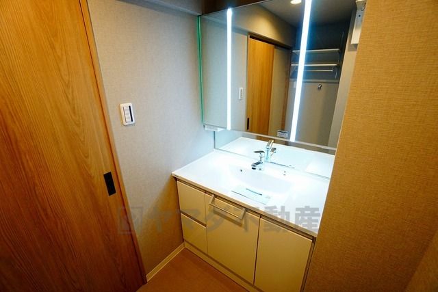三面鏡つき洗面台。鏡裏にたっぷりとした収納スペースがあります。鏡を閉めてしまえば小物は見えないため、スッキリとした印象の洗面台にできます。