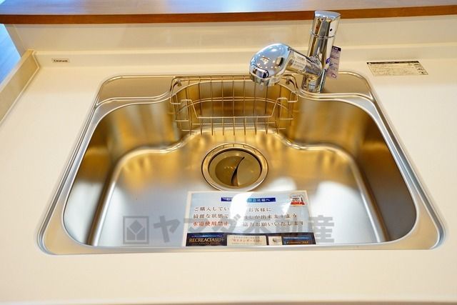 広々としたステンレスシンクには、洗剤やスポンジを収納出来るラック付き。広さも確保しているので、大きなお鍋も洗いやすいです。