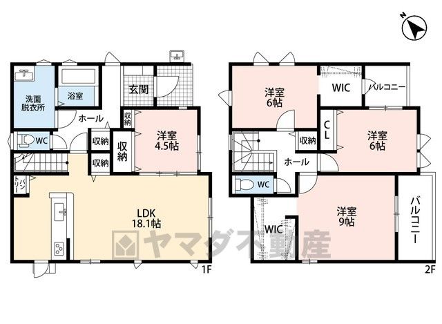 LDK18.1畳(1F)、洋4.5畳(1F)、洋6畳(2F)、洋9畳(2F) |