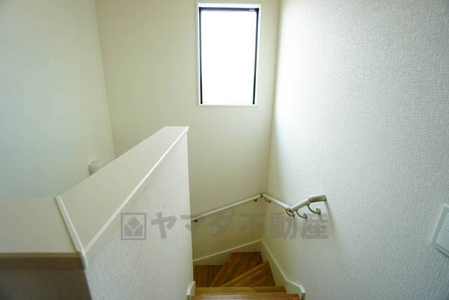 小さなお子様やご高齢の方でも安心できる、手すり付き階段。段差も低めで設定されており、安全性にも優れています。
