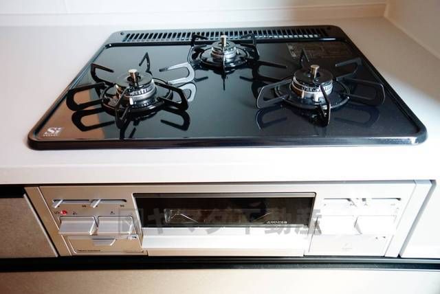 同時にたくさんの料理が調理できる3口コンロ。長時間熱を通しておきたい煮込み料理を作りながら、炒め物など同時進行で進められます。
