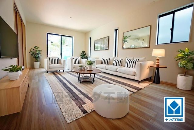 家具はイメージです。大きな窓のあるリビングは、陽光あふれる明るい空間です。居心地良く、ご家族皆がゆったり寛げる憩いの空間となりそうです。