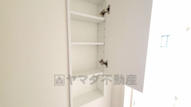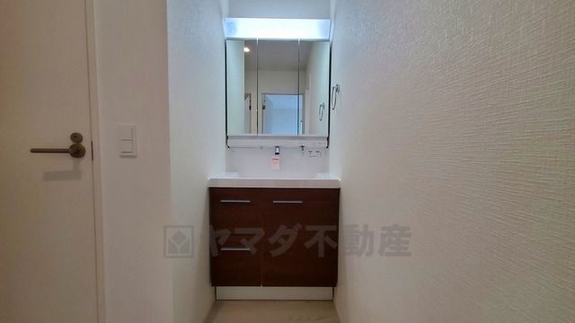 三面鏡の裏側に収納スペースを設置。化粧品や洗面小物などをすっきりと収納できます。