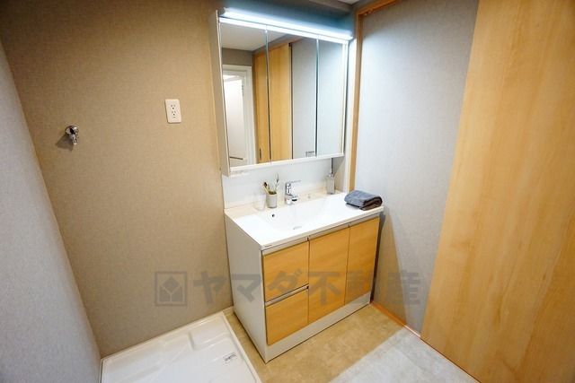 三面鏡つき洗面台。鏡裏にたっぷりとした収納スペースがあります。鏡を閉めてしまえば小物は見えないため、スッキリとした印象の洗面台にできます。