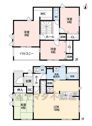 LDK18畳(1F)、和6畳(1F)、洋6畳(2F)、洋8畳(2F) |