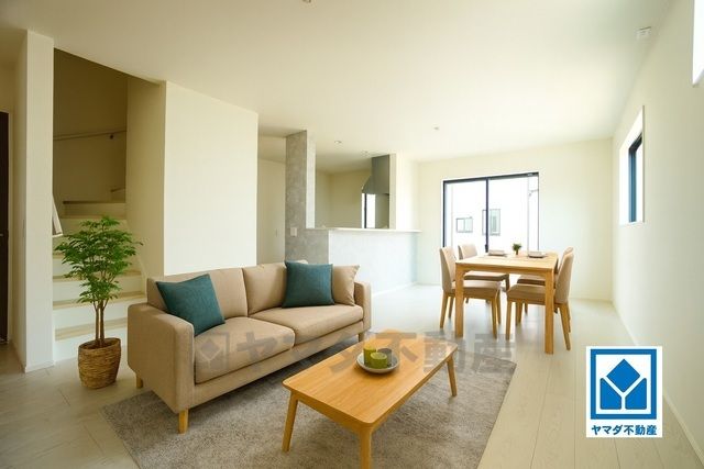 家具はイメージです。大きな窓のあるリビングは、陽光あふれる明るい空間です。居心地良く、ご家族皆がゆったりくつろげる憩いの空間となりそうです。