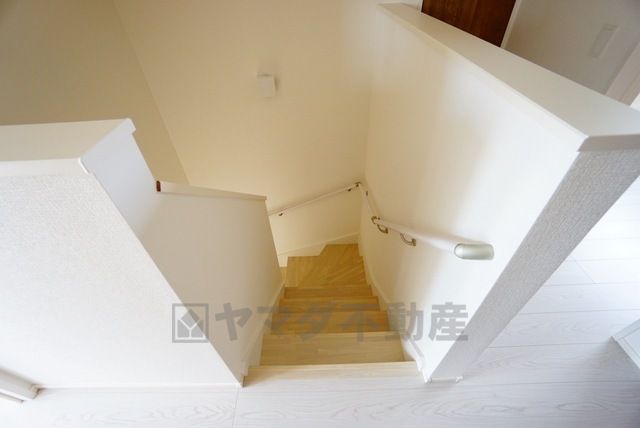 小さなお子様やご高齢の方でも安心できる、手すり付き階段。段差も低めで設定されており、安全性にも優れています。
