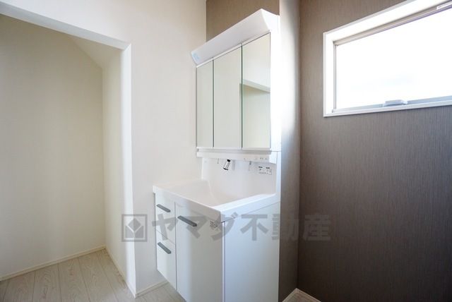三面鏡つき洗面台。鏡裏にたっぷりとした収納スペースがあります。鏡を閉めてしまえば小物は見えないため、スッキリとした印象の洗面台にできます。
