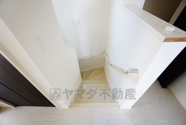 小さなお子様やご高齢の方でも安心できる、手すり付き階段。段差も低めで設定されており、安全性にも優れています。
