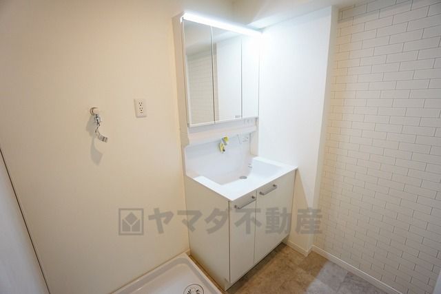 三面鏡つき洗面台。鏡裏にたっぷりとした収納スペースがあります。鏡を閉めてしまえば小物は見えないため、スッキリとした印象の洗面台にできます。