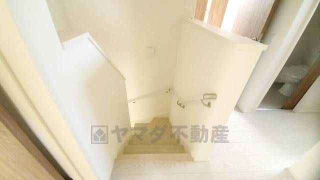 小さなお子様やご高齢の方でも安心できる、手すり付き階段。段差も低めで設定されており、安全性にも優れています。