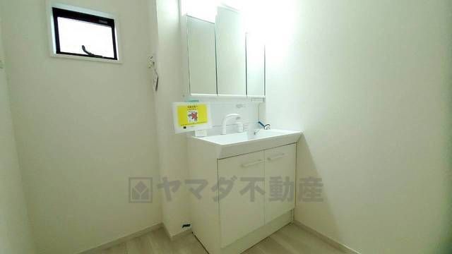 三面鏡つき洗面台。鏡裏にたっぷりとした収納スペースがあります。鏡を閉めてしまえば小物は見えないため、スッキリとした印象の洗面台にできます。