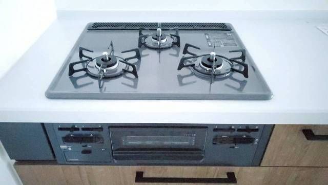 同時にたくさんの料理が調理できる3口コンロ。長時間熱を通しておきたい煮込み料理を作りながら、炒め物など同時進行で進められます。