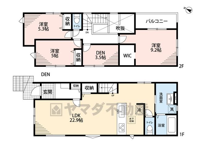 LDK22.9畳(1F)、S3.5畳(2F)、洋5畳(2F)、洋5.3畳(2F)、洋9.2畳(2F) |
