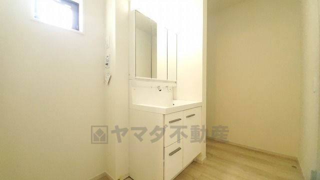 三面鏡つき洗面台。鏡裏にたっぷりとした収納スペースがあります。鏡を閉めてしまえば小物は見えないため、スッキリとした印象の洗面台にできます。
