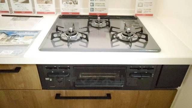 同時にたくさんの料理が調理できる3口コンロ。長時間熱を通しておきたい煮込み料理を作りながら、炒め物など同時進行で進められます。