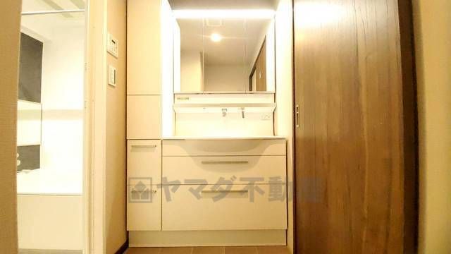 三面鏡つき洗面台。鏡裏にたっぷりとした収納スペースがあります。鏡を閉めてしまえば小物は見えないため、スッキリとした印象の洗面台にできます。